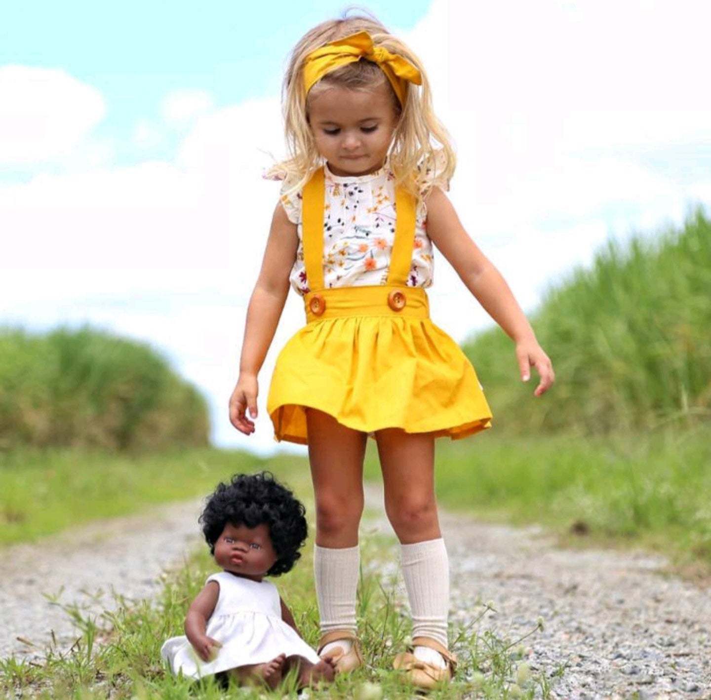Colour: Yellow Ruffle Sleeve Top with floral graphics, yellow suspender skirt & matching headband