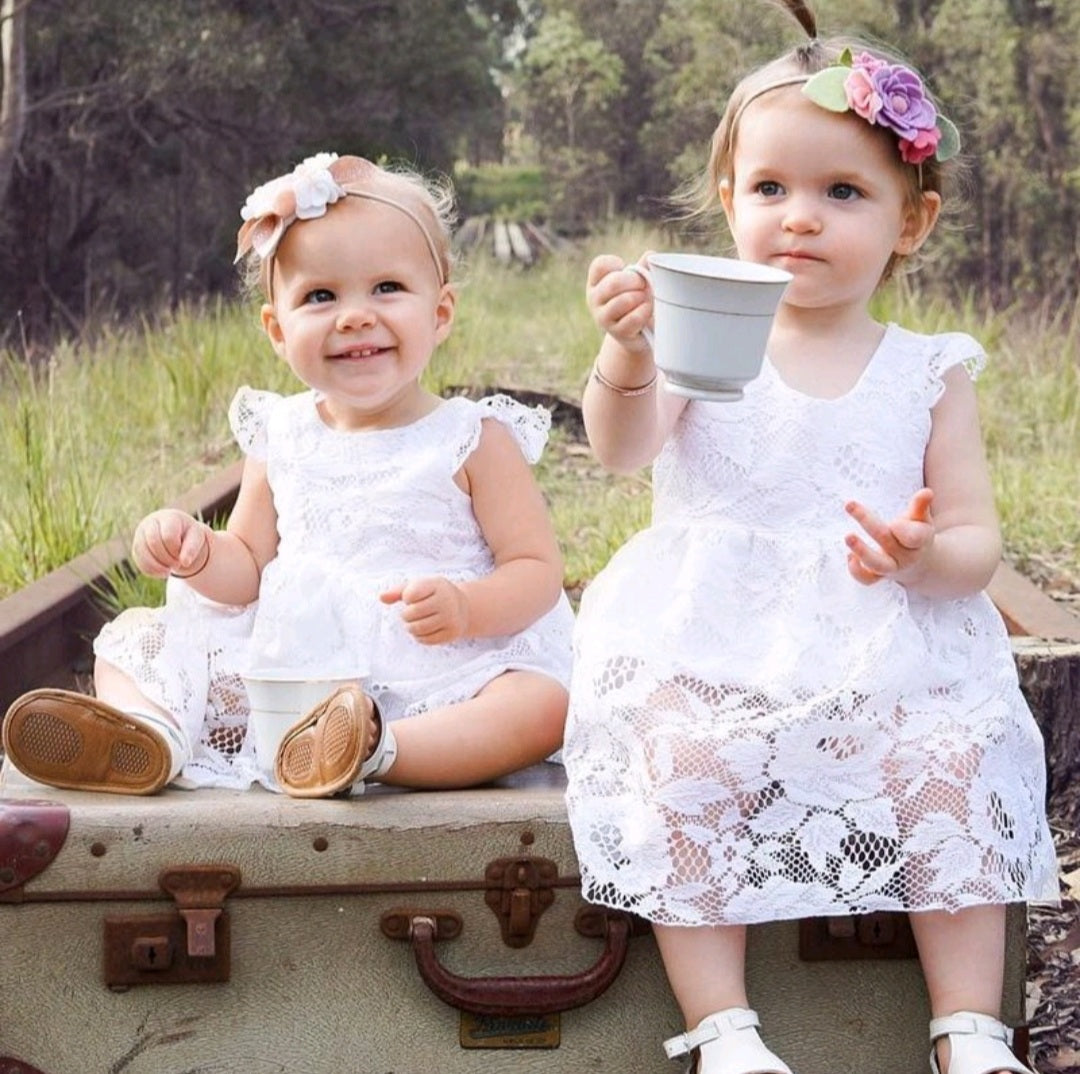 Cotton White Lace Bodysuit/Romper, Crew neck, Frill sleeves, Press-stud closure, Mesh Skirt